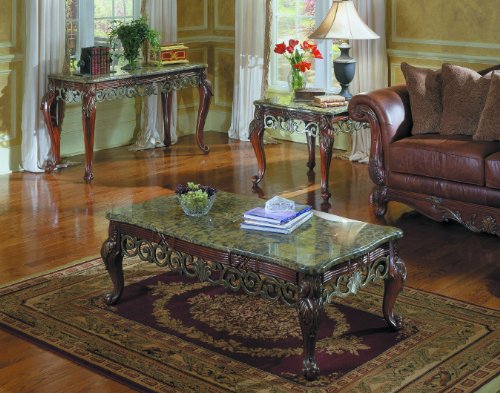 Reed and tie accents with ironstone marble tops all wrapped together in a rich warm cherry finish. This signature table grouping is the perfect accent for the matching fabric or leather upholstery. What's included: End Table (1).